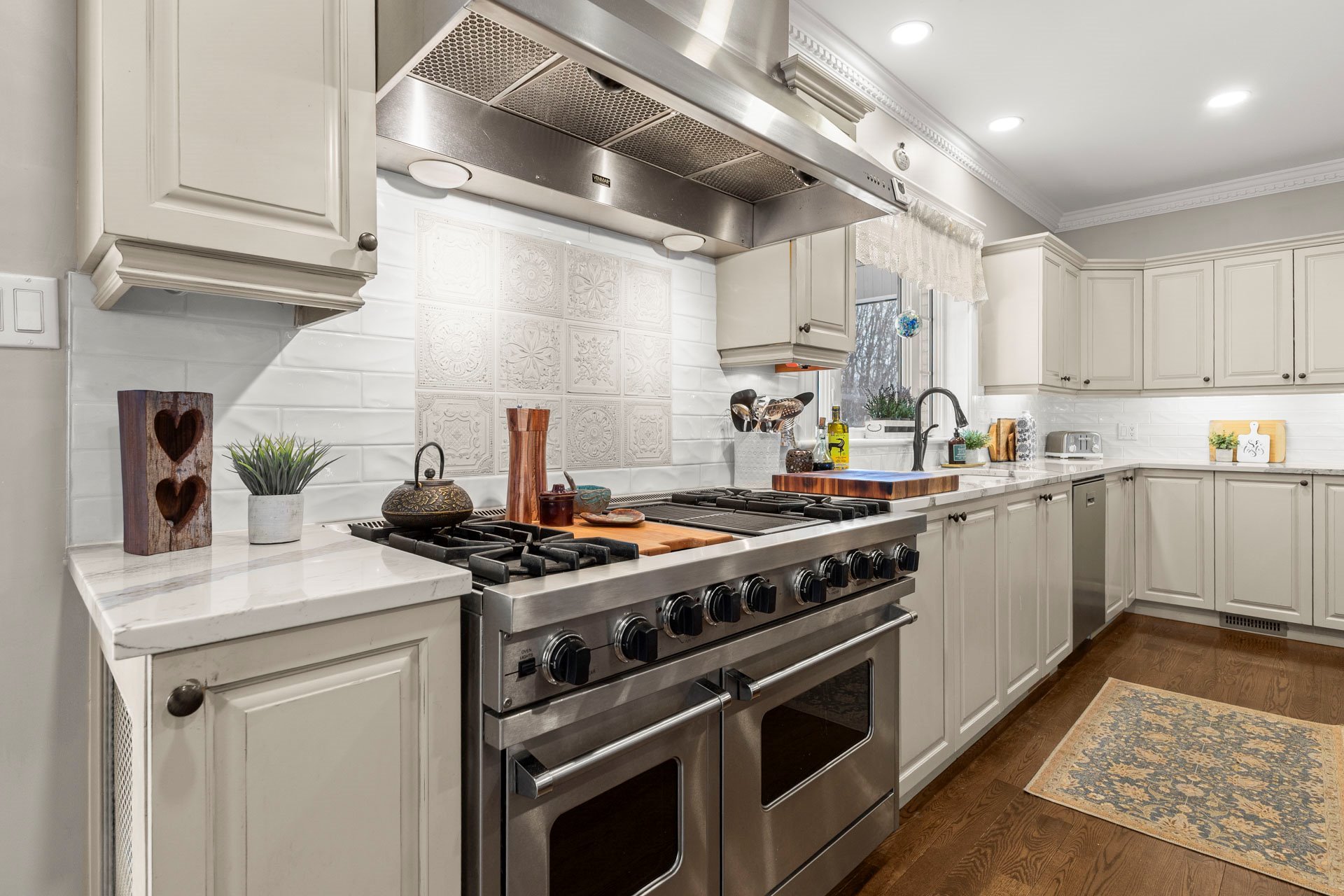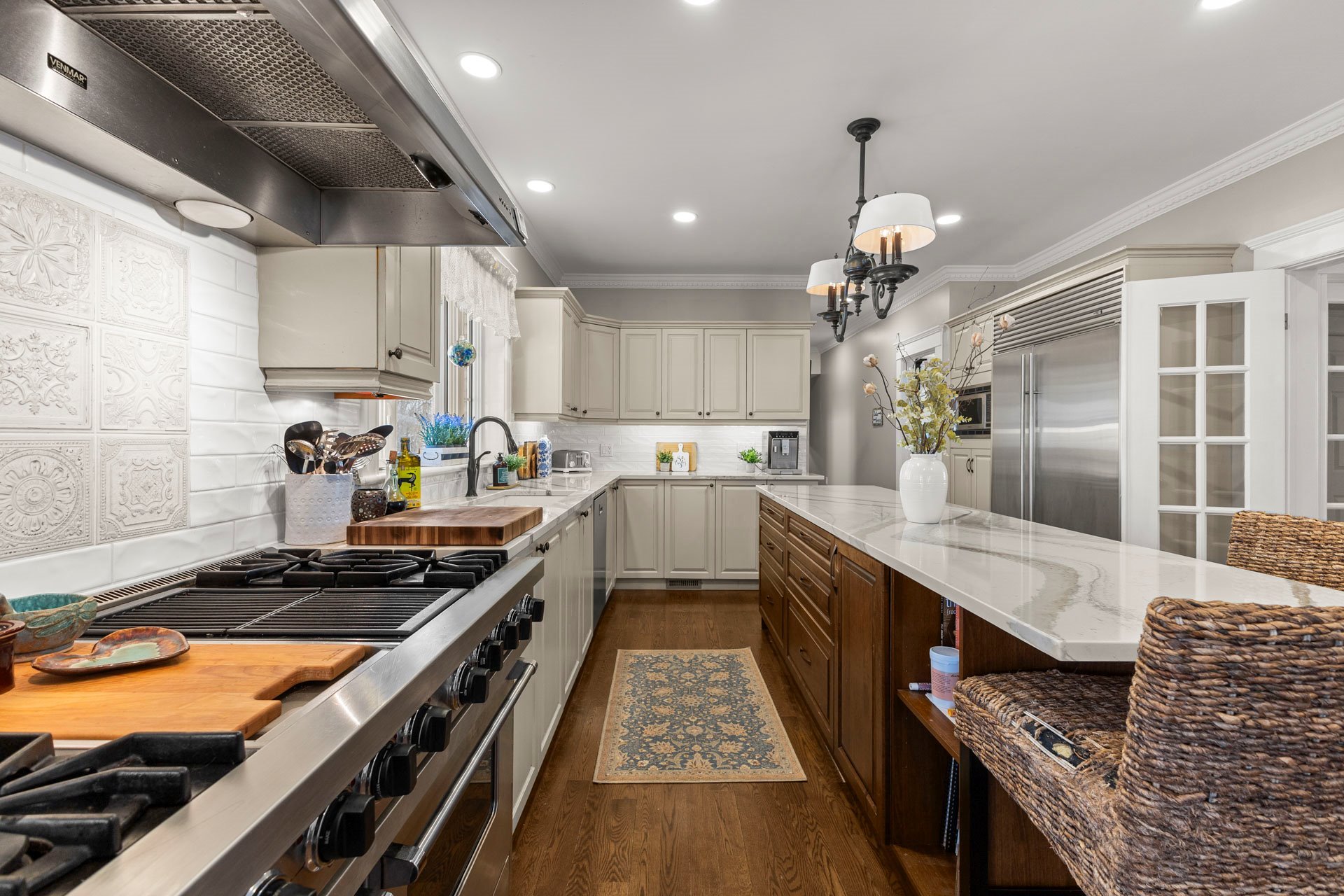 toiture, cheminée dans le salon, comptoirs de cuisine,