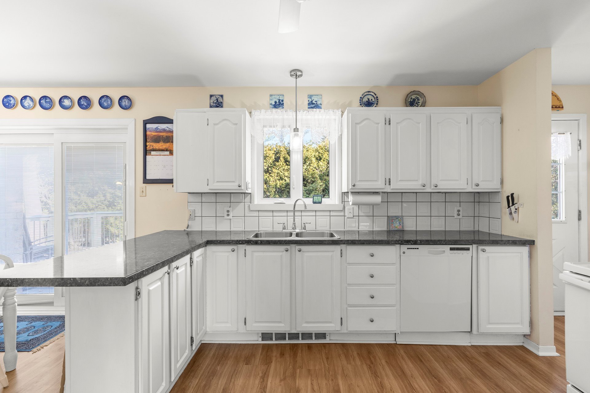 The cozy kitchen with white cabinetry has tons of