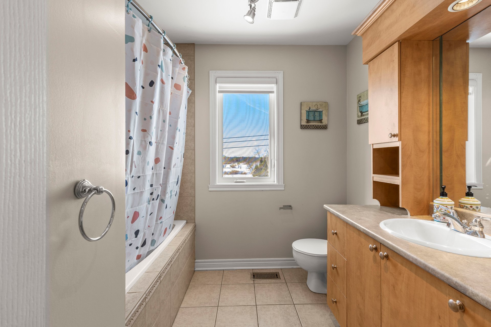 offers 3 full bathrooms and 1 powder room. The bright
