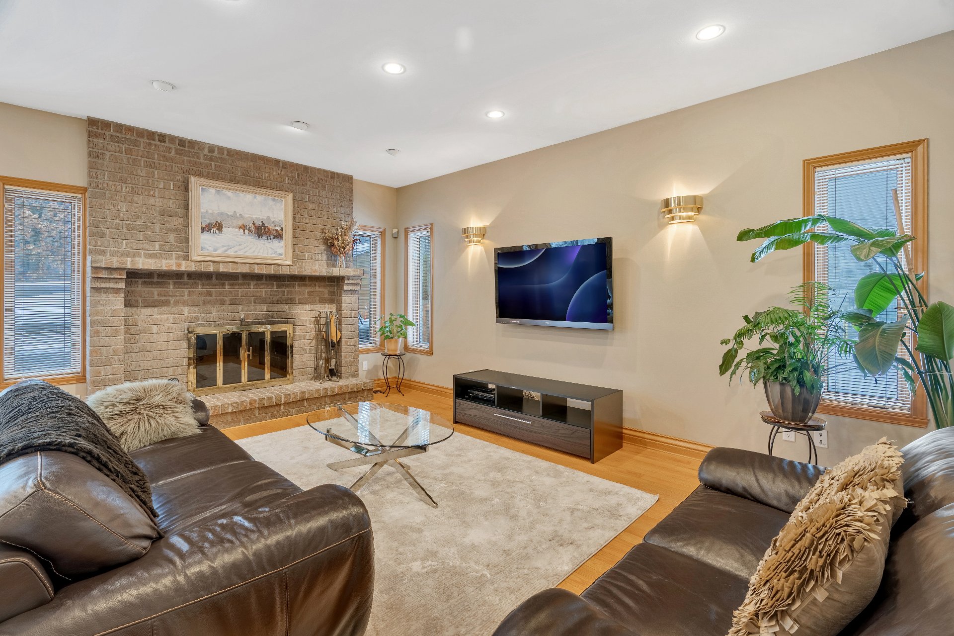 family room with a wood-burning fireplace, creating the