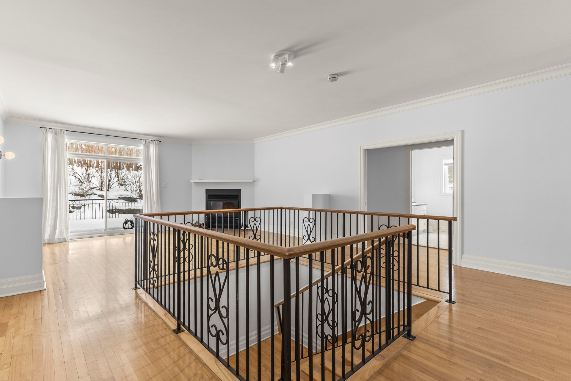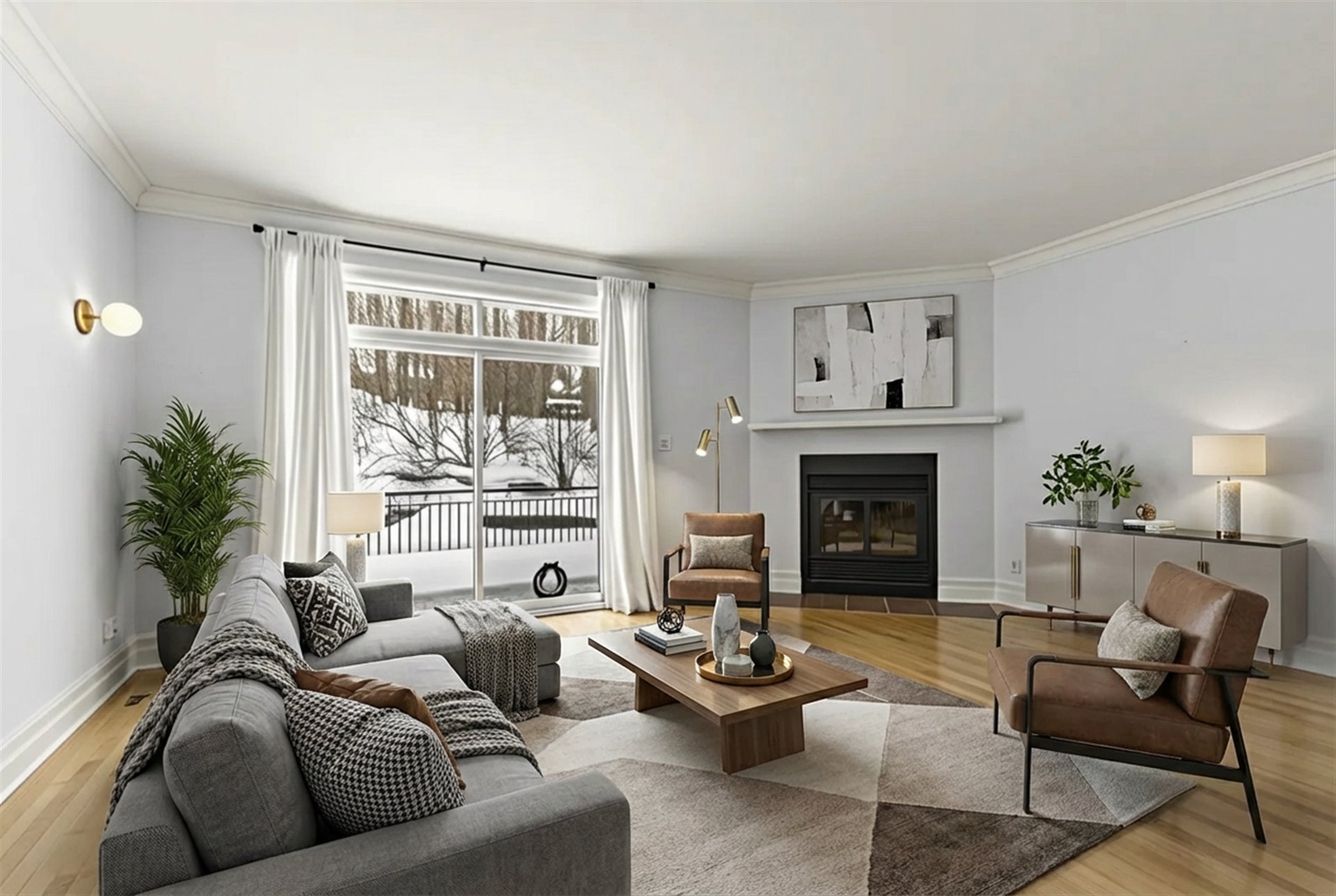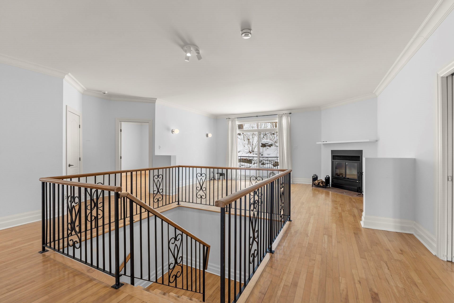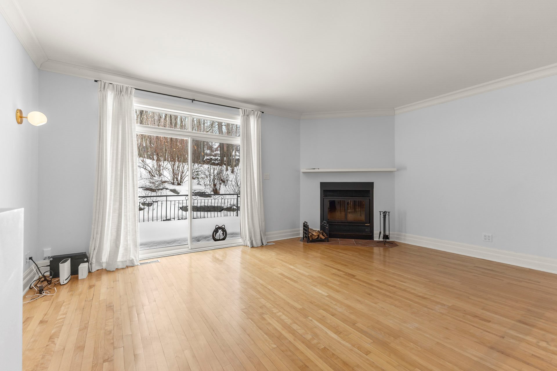 room, anchored by a classic wood-burning fireplace and