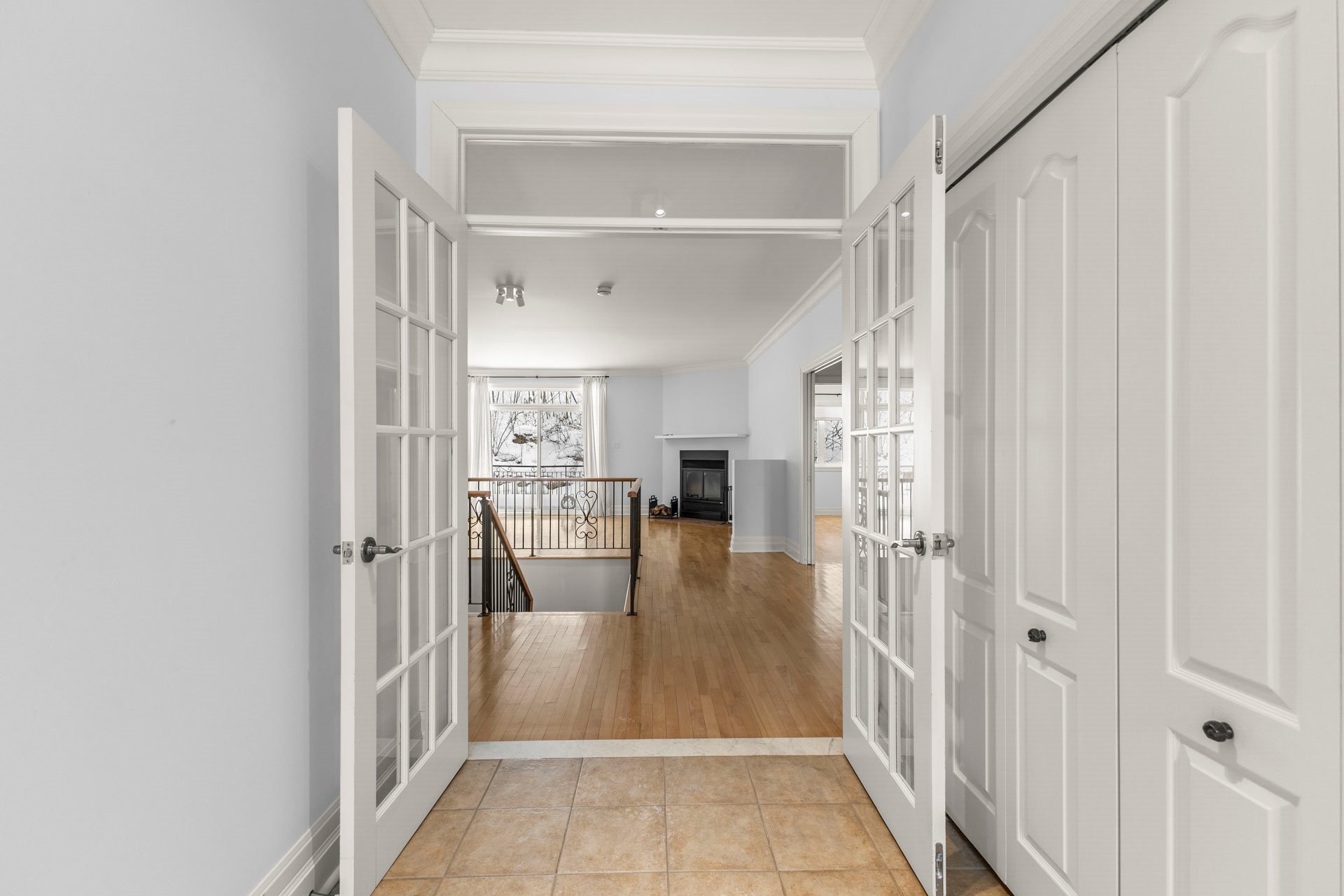 Step inside a large, bright foyer with tiled floors and a