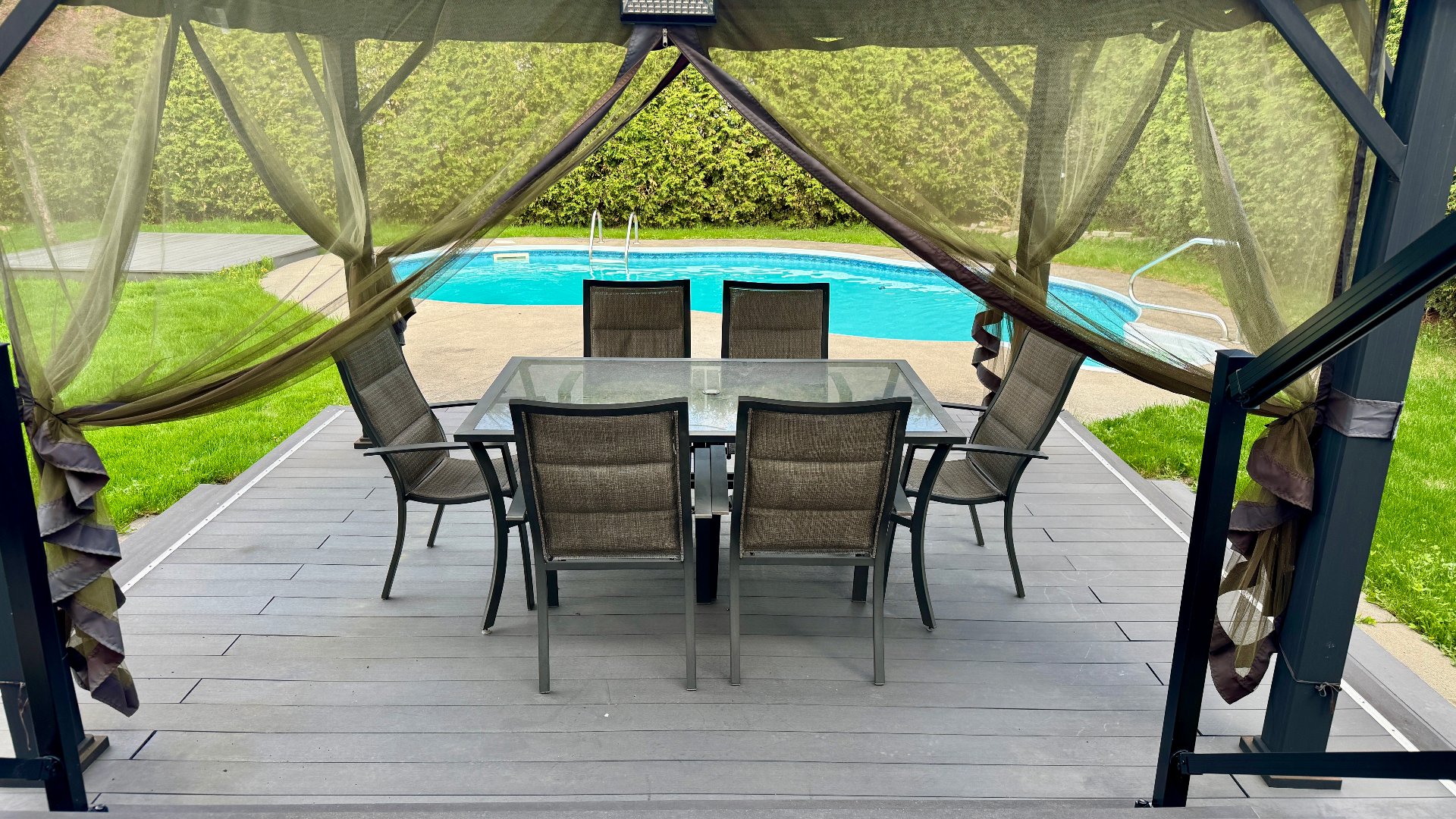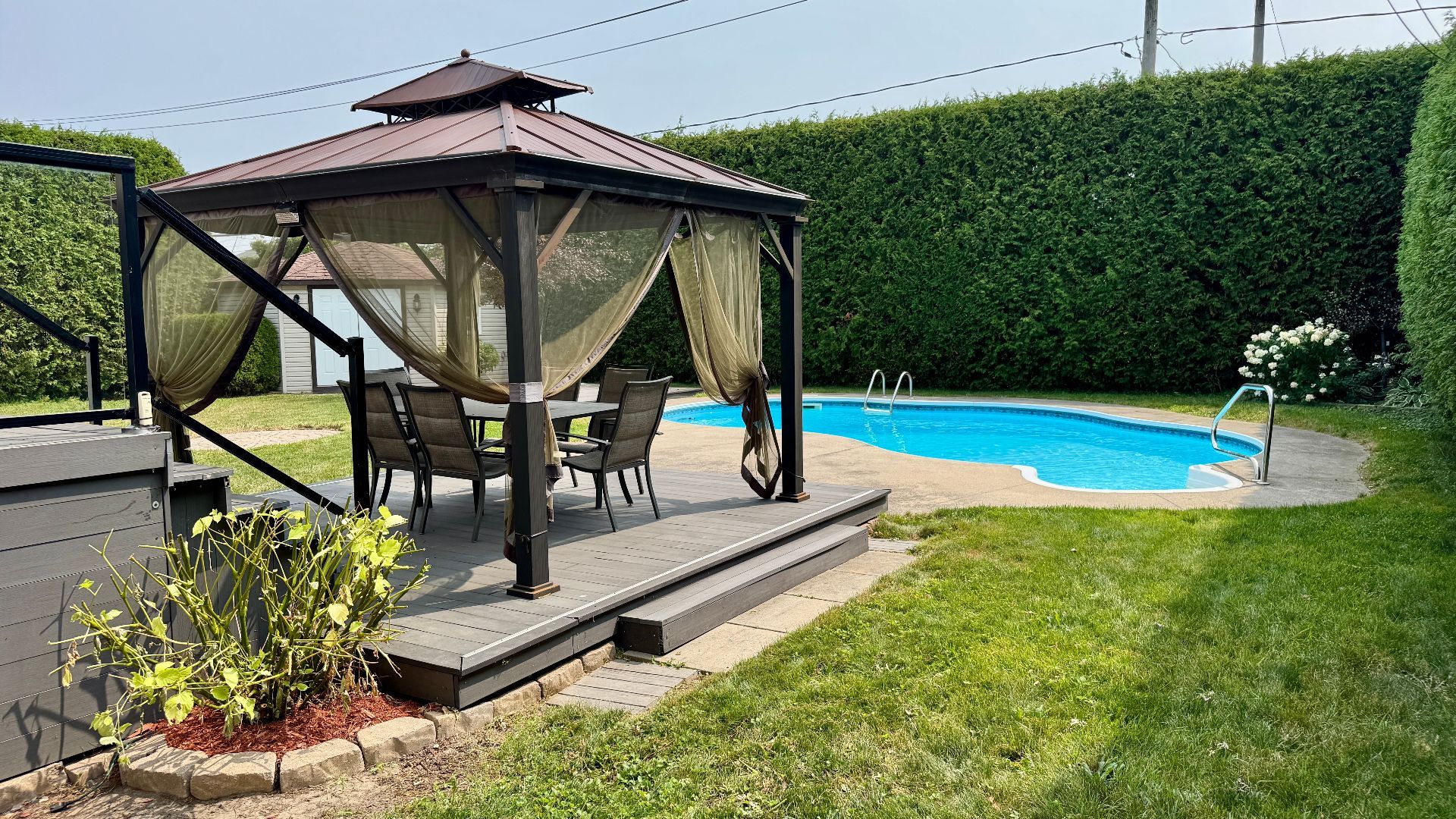 Inclusions : central vacuum, garage door opener, pool heat pump and accessories, blinds, gazebo, irrigation system